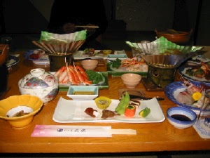 温泉の後は、待ちに待った夕食で〜す。どう? 我が家の評価は、可も無く不可も無く。普通・・・でした。(^_^;) きびし〜〜〜〜〜い。しかし、主婦にとっては上げ膳据え膳で食べられるだけで、しあわせ〜〜♪