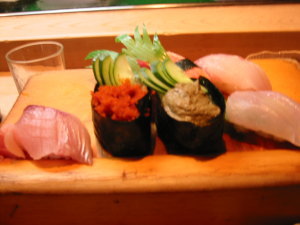 香住漁港の近くの海岸通りにある「三七十鮨」へ。まずは上にぎりを注文。イカを食べた所で写真を撮り忘れたのに気が付き、とりあえず1枚パチリ。これはカニみそ、カニの子、カニの身を含み8カン。カニのシーズンではないけど美味しかった〜。特にカニみそ!たっぷりでウマウマ。ちなみにカニの子の後はマグロ。この他に、ヒラメとアワビを注文。その場でおろして・・・新鮮さは抜群!!