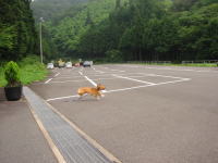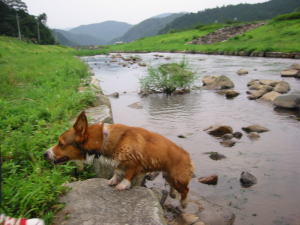 但東町のシルク温泉へ到着〜。温泉に入る前に、またまたアトムのお散歩です。横を流れてる川が前々から遊べそう♪とチェック済み。どうせ今日はシャンプ〜だし、とことん遊んで