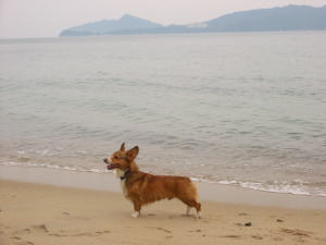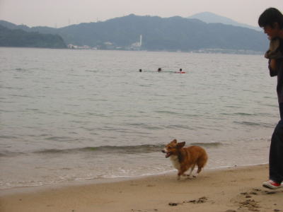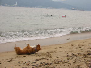 近くの砂浜は人!人!人! 少し歩いて人のあまりいない所でアトムを遊ばせる事に。海を見るや、自分から入って行きました。でも、波打ち際で遊ぶだけ。(^_^;)