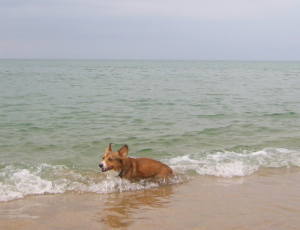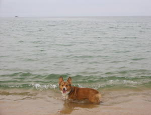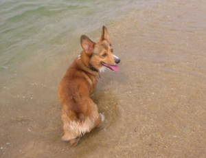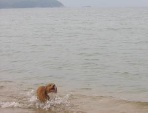 フリーにすると、何の問題もなく海にバシャバシャと入って行くアトム。今回は、短パンとビーサン持参の私。アトムと一緒に海に入りま〜す。でも、この海岸。波打ち際からちょっと入ると深くなってる。短パンでは濡れそう。(^_^;) 濡れるとぱんち持って来てないしぃー。結局、波打ち際でしか遊べませんでした〜。