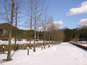 現地に到着!良かった〜雪がある〜。場所は城崎郡日高町にある「植村直己スポーツ公園」。ここは冒険家の植村直己さんが生まれ育った町。もう少し山の方へ車を走らせるとスキー場があります。