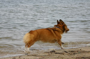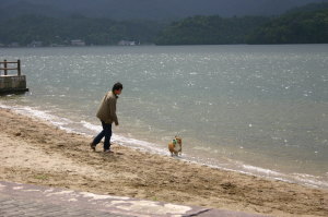 食事の後は、アトムと一緒に遊ぶぞぉ〜。海にも行きたいけど、まずはすぐ向いにある、「かぶと山公園」へ。ここはキャンプも出来る施設がある。少し芝生の広場もあったけど、下へ降りて行くと少しだけ砂浜があったので、ここで水遊び楽しんじゃお♪ アトムはリードをはずすと一目散で海へ〜。イマイチお天気が良くないので、青い海と青い空〜って訳にはいかないけど、今年初めての海〜〜〜。