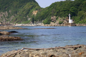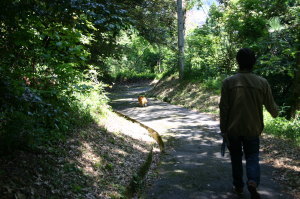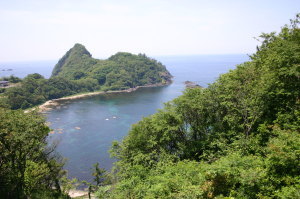 食事の間は車でお留守番のアトム。さて次は、アトムと遊ぼう!すぐそこが海〜。近くには休暇村竹野海岸キャンプ場がある。とりあえず、キャンプ場の駐車場まで移動。このキャンプ場は、ペットOKみたい。海までの遊歩道がいくつかあるので、まずは弁天浜まで歩いてみました。