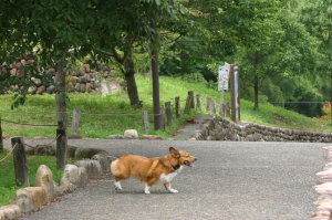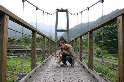 さて、どこに行こ〜。お天気がそんなにいい訳じゃないけど、ムシムシって感じだし、やっぱり水のあるところがいいなぁ・・・と、念のためにチェックしていた山南町にある「川代公園」へ。だいたいの場所をナビにセット。なんだかちょっと遠回りをさせられたような気もするけど、無事到着〜。キャンプ場もあり自然散策路があるって事だったので、いい所かなぁ〜と期待して行った。まずは、広場に行くのに吊橋がある。アトムの反応はどうかな?と思ったけど、なんの問題もなく旦那とスタスタ。後からついていくと結構揺れてるじゃん。(^_^;)