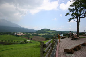 アトムを車に残し、みんなで牧場の中へ。ここで今日はお昼ご飯を食べる事にした。ピザやソーセージやうどん、おにぎりなどを買ってきて、テーブルでおしゃべりしながら・・・。やはり、少し市内より気温も低い感じで、時折吹く風が気持ちいい。