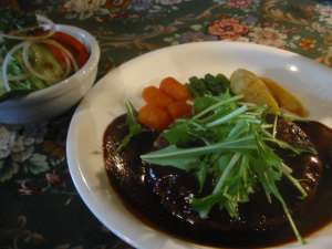 メインは日替わり、今日はハンバーグ。結構デカイ。 |