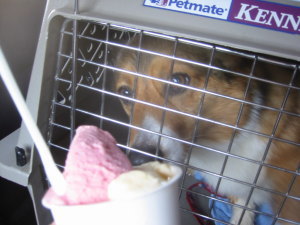 ひとしきり遊んで、次はアイスを食べに行こう♪ しかし、アトムはお決まりの乗車拒否。まだまだ遊ぶ気マンマン。(笑) なんとかクッキーでつってバリケンへ。