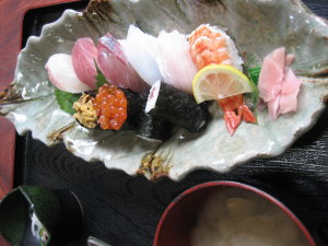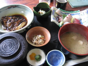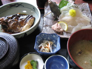 ここは「あら炊き」が有名だそうで、骨まで残さず食べられるくらいやわらかい。左から旦那、義父、義弟が食べた「磯定食」。義妹が食べた「上にぎり定食」、これに天ぷらがついてました。そして、私が食べた「カワハギ造り定食」です。お刺身も新鮮で、かんぱちのあら炊き美味しかった♪ 実はお店に入ってすぐに水槽の中の伊勢えびに釘付けだったのだけど、5000円〜と言う値段に、嫁の分際でそこまでは言えないよなぁ〜。(苦笑)