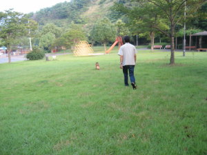そして、旦那実家に寄り、しばし談笑した後、お土産をいっぱい貰ってさようなら〜です。その後は、もちろん健康の森へ。(笑) 今や、旦那実家と健康の森はセットですな。今日も暑いので少しだけサッカーをしようといつもの場所に行くと、生憎子供達の先客が。少し離れた場所まで歩いて行ってプールもセットして、サッカー開始。しばらく遊んで満足かと思いきや、アトムの様子が変。サッカーボールも入っていないのに、カバンに顔を突っ込もうとしている。何? サッカーの集中力も途切れたので撤収しようとプールに手を入れると、水がぬるい。どうもクールダウンがイマイチで、冷たい水でも探していたのかも。この旅行中、水と言えば車の冷蔵庫でヒエヒエの冷たい水ばかり飲んでたもんね〜。ある意味贅沢なヤツだ。(苦笑)
