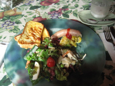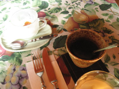 朝食はワンプレート。フレッシュジュース、ヨーグルト、コーヒーと一緒に。