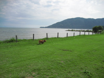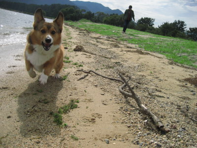 砂浜はゴミもあるし、魚が死んでたり、水の中もひっくり返って死んでるし、ここでみんな遊んでるの?(^_^;) アトムは枝レトリーブをやる気マンマンなのだけど、投げると波打ち際でSTOPしてしまう。ビビリ〜なので、初めての場所ではやっぱり慎重だ。結局、何度やっても取りに行かないのでやめ〜。(苦笑)
