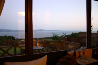 我が家がお世話になるのは、離れ。宿が高台にあるので、部屋から橘湾が見渡せます。犬に関しての一切の注意事項もなく、「わんちゃんの好きなようにさせてあげて下さい」と言って貰いました。ま、そこはもちろん常識の範囲内ですけどねー。犬用の備品も揃っていました。