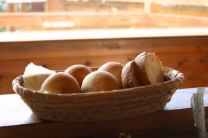 パンは自家製で焼き立ても出て来て、アトムにも少しお裾分け〜。食後はコーヒーを頂きました。