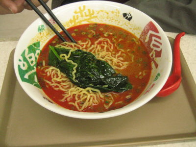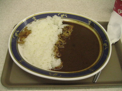 去年、「皿うどん」が名物のSAがあって、今年はそれを!と食べる気マンマンで、丁度20時頃になった美東SAで晩御飯にする事にした。美東の下りの名物が「ちゃんぽん」だったので、ここに違いないと信じ込んでいた。まずはアトムに晩御飯を食べさせ、さぁ・・・と行ってみると、あれれ?ない・・・。「皿うどん」は結構なボリュームだったから分けて食べて、足りない分は何か食べよう・・・とか散々盛り上がってたのに〜。(苦笑) 仕方ないので旦那は「坦々麺」私は「カレー」。 (帰って去年のレポを見返すと、皿うどんは次の下松SAでした。ちゃんちゃん)