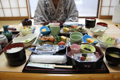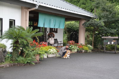 凄い雨の音で夜中に何度も目が覚める。今日は比較的爆睡のアトムも、雨の音にびびって窓から離れたお風呂の前のフローリング部分に非難してた。(苦笑) それでも結構寝れてる模様。ようやく落ち着いてきたか・・・、それとも疲れが出てきたか。(^_^;) 食事の時間は8時なので、今日は少しゆっくり起床。7時頃には雨も小降りになってきたので、アトムのお散歩に出掛けた。良かった〜。レインコートやタオルがあるとは言え、あまりに凄いと後で部屋に上げるのはばかられるもんね。お散歩に行ってる間に旦那は朝風呂。ようやく旅行気分を味わえたかな。
