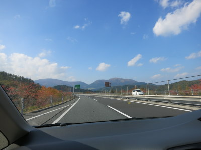 中国自動車道を走るのは久々。岡山の勝央SAで休憩。ドライブ中心のお出掛けなので、のんびり進みます。落合JCTから米子自動車道に入り、蒜山高原SAで休憩。この辺りまで来ると山も色づいてきてる。