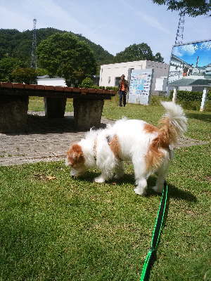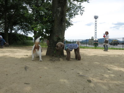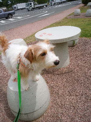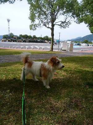 ドックランがあるので次の広島の「福山SA」でも休憩。11時過ぎに到着。ドックランではサルーキとトイプーが遊んでいた。アポロは上手に挨拶が出来て、トイプーちゃんと4,5回追ったり、追われたりで走って遊んだけど、すぐに匂いとりばかり。なので、ほどほどで撤収。