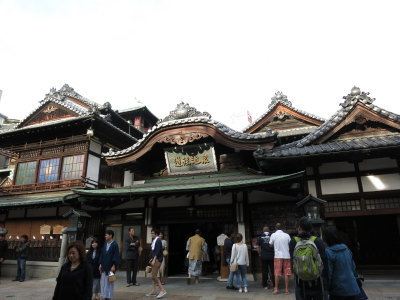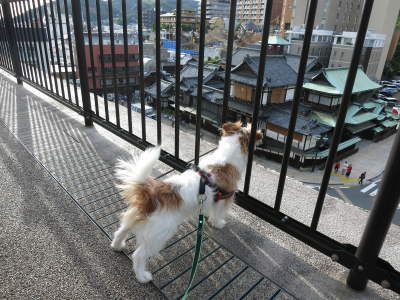 道後温泉の中心部手前のコンビニで運転を交代して、「道後温泉本館」を目指します。17時頃到着。前の駐車場に車を止めて、旦那だけ温泉へ。私は学生の時に来た事があるので、アポロと車で待機しつつ、お散歩。
