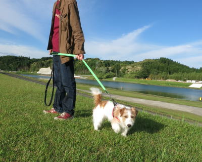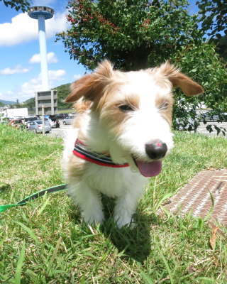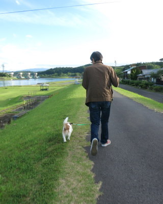 旅行四日目。青空の気持ちのいい朝♪ 宿の裏の河川敷に旦那も一緒にお散歩に行った。ここに泊まるのは、アトムと2回、アポロとは3回目なのに、朝のお散歩に付き合うのは初めてらしい。信じられん・・・。