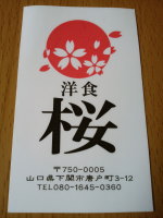 今日のお宿の「旅籠屋 壇ノ浦PA店」は、中国道の下りからはそのまま高速から宿泊出来るのだけど、上りの時は一般道から入らなければいけないので、今日の晩御飯は下関で食べようと相談していた。旦那が候補のお店を探してくれてて、その中から一番行きたいのは「洋食 桜」だったけど、駐車場がなさそうだし、洋食の「まつもと」は駐車場があるので、そこを目指す事にした。でもお店は21時まで。もしかして20時半にはオーダーストップだったりして・・・と思いつつ、とりあえず急いだ。下関ICで下りて、お店の前に着いたのが20時半ぎりぎり。私だけ、お店に。お店の扉を開けると・・・チーン、片付けをしてる感じ。聞いてみたけど、もうお終いだって。ガーン。途中で見た「リンガーハット」でもいいよ・・・とは言ってみたけど、もうこうなったら「洋食 桜」に行って見る事になった。ナビの現在地とお店の場所の関係がイマイチ良くわからないけど、見つけた駐車場に車を止めて歩いて探す。こういう時スマホって便利〜♪ なんとかお店を見つける事が出来た!