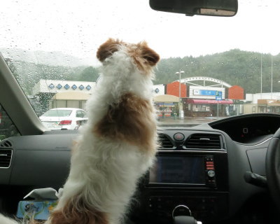 10時を回ってから、広島の宮島SAに到着。SAに止まるとアポロはお散歩すると主張する。(^_^;) 雨なんてへっちゃららしい。レインコートを着せたり、後で拭いたり,・・・こっちは結構大変なんですけど。(苦笑)
