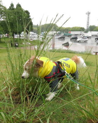 中国道の美東SAに8時過ぎに到着。朝、お散歩出来てないので雨の中アポロのお散歩。