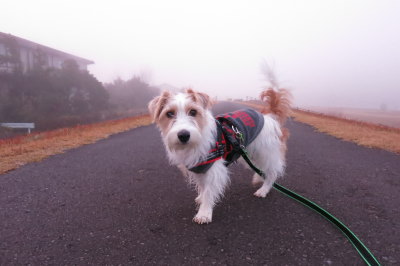 6時起床。暖房を点けっ放しで寝たけど、結構寒かった〜。身支度を整えアポロのお散歩へ。外は朝靄で真っ白。