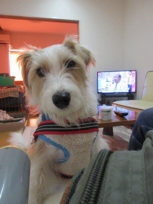 朝ご飯を食べて、恐る恐る部屋に戻ると、うん@をしてなかったー。朝のお散歩でうん@をしてなかったので、心配してたけど、良かった〜。いい子でお留守番出来たねーとおやつを奮発♪