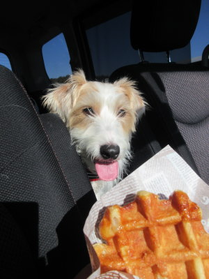 私だけワッフルを追加〜。アポロもちょこっとお裾分け。期待に胸膨らんでる顔〜。(笑)