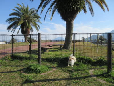 16時前に「桜島SA」に到着。今日は桜島が割とよく見える♪ しばらくすると秋田犬がお散歩にやって来た。しばらく様子を伺っていたアポロ。柵の近くを歩いている秋田犬に向かって、後ろ足を後ろに蹴り上げた。アトムは良くやっていたけど、アポロがやるのを見るのは初めてー。秋田犬が動くと、自分も移動してキックキック。対抗意識を燃やしていたのか!?(笑)