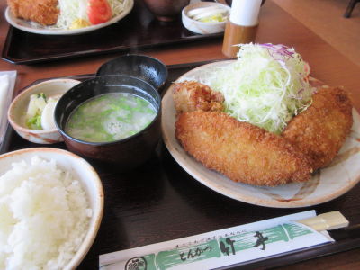 お散歩をして車に戻ると、旦那はもう車にいた。意外と早かったのね。(^_^;) まだお昼ご飯の時間には早いので、「とんかつ竹亭 田上店」まで行って、とんかつを食べる事にした。11時半OPENなので、実家の備品を買いに近くのCOOPへ行って買い物。11時半前にお店に着くと、駐車場は凄い車。(@_@) 旦那が様子を見に行くと、すでにたくさんの人が席に座っていたよう。急いで店内へ。すでにお待ちまで〜〜〜。でも2人だったので、すぐに席に案内して貰えた。まだ営業時間じゃないのでどういう事?(^_^;)