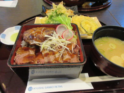 ここでまずはお昼ご飯。レストランで一度食べてみたかった阿蘇のあか牛のメニューがあったので、私の希望でそちらに。