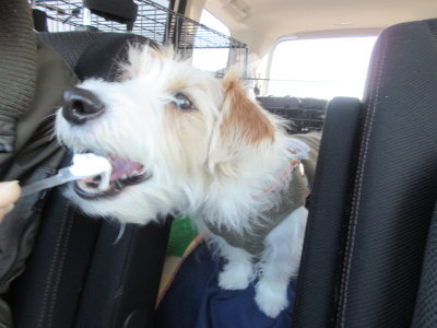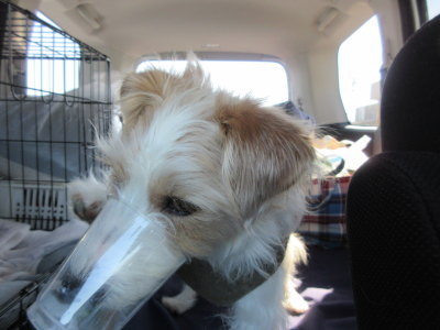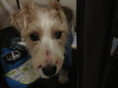 お泊りの後、マズルの横が両方少し赤くなっていたから、そこから出血。(>_<) 車のゲージの柵の間に顔を突っ込んで、帰りを待っていたのだろうなぁ・・・。まだまだ置いて行かれた傷が癒えていないのかな。(泣)