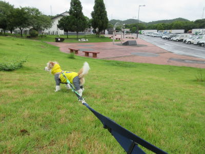 12時20分頃、兵庫の「龍野SA」に到着。ちょっと雨が降っているけど、アポロのお散歩。