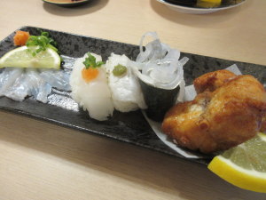 アポロに晩ご飯を食べさせ、晩ご飯はクーポンの使えるお店に行く事にして、「カモンワーフ」へ行ってみた。随分前にアトムの頃に隣の「唐戸市場」でお昼ご飯を食べた事はあったけど、ここは初めて。何を食べようか迷って、結局「すし游館」でお寿司を食べる事にした。