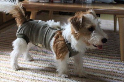 ![]() ![]() 2015.08.06(木) おもちゃと一緒に、アポロの術後服が届いた。一応、サイズチェックの為に試着。トイレも大丈夫そうかな。 |