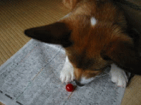 アトムの今日のおやつは、無農薬自家栽培のミニトマト。新聞ランチョンマットの上で食べて頂きま〜す♪(笑) 犬って食べるのヘタですよねー。ボトボト落としまくるしぃ・・・。