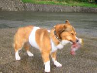今日は暑さも少しマシだったかな? ムシムシ・・・ってのが少なく、風も吹いてるし。最近、日が暮れるのが早くなってきたので、少し早めに河川敷へ。まずフリから。3投目くらいでアトムは横にいた母親の方に行ってしまった。フリを持って帰る途中に立ってるもんだから、どうやらボールが入ってるカバンが目に入ってしまったようだ。何度も呼んでフリを持って来させようとしたけど、カバンのそばから離れようとしない。最終的にはフリを持って帰ってきたけど、フリよりボールで遊ぶ方が好きみたいね。(^_^;) それと最近、電車でGO!をやってないもんだから、欲求不満気味か?汽車の音がしないかが気になって、注意力散漫なのでありました。そうそう都合よく汽車は来ないんだよぉーーー。汽車の来ない時間を見計らってるしね。(^_^;) #短い足でカイカイ。 |