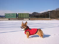 今回の寒波では、雪が降るけど積もらない。せっかくソリを買ったから遊びたいのにー。降って欲しい時に積もらないのは、なんだかなぁ〜。今日は車を30分程走らせて、スキー場のある山のふもとの公園まで行ってみた。初めて来た公園。ノーリードに出来るような芝生の広場はないけど、グランドに雪が積もってると、充分遊べそう。今日はお天気も良くて、青い空と白い雪〜♪気持ちいい。少し風が強いし、ババが車で待機中なので、くるっとお散歩しただけだったけど、久々の雪で楽しそうに走るアトム。週末にかけて、もう少し降ればいいのになぁ〜〜〜。 |