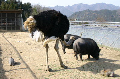 | 3月16日(火) 今日もいいお天気〜♪買い物の前に河川敷へ。行ってみると、工事車両とおじさん数人。あら、工事?と思ったけど、作業してないので前を通過して行った。すると、背後から「よ〜肥えとるなぁ〜」と。コーギーは良く言われる言葉だけど、つい「いえいえ、アトムは細いのよ・・・」と言いたくなってしまう。(^_^;) 午後から、またまたカメラ持参でご近所散策。この前から、我が家から見える梅の木が気になって気になって。(^^ゞ 遠目で見えるのがめちゃくちゃキレイなのだ。直線距離では近いけど、回っていかないといけないのよね。道端から写真を撮らせて頂いた。横には桜の木もあって、ちらほら咲き始めていた。ソメイヨシノでは無さそうだけど。枝が高くて上手く撮れなかった〜。その後、その先に園芸店があるので、そこへ。いつもホームセンターとかでついでに花を買うので、今まで行った事がない。しばし花を物色。ふと見ると奥にミニ動物園の看板がある。行ってみるとなんとダチョウが!お店の方に写真を撮ってもいいかと聞くと、メガネが嫌いらしく、近づくとつつかれるから気をつけてと。私、狙われる?(^_^;) しばらくカメラを構えてみたけど、ナイスショットは撮れず。残念。(T_T) |