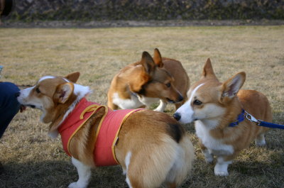| 3月20日(土) 今日は、お友達のももママさんからメールを頂いて、一緒に河川敷で遊ぶ事になった♪ ババにはお留守番してもらって。誘われたら出かけやすいのだぁ〜。(^_^;) ももちゃんと会うのは2ヶ月ぶり。久々に会うももちゃんは大きくなってる〜。最初に会ったのが4ヶ月だったかな・・・。今はもう9ヶ月。月日が経つのが早過ぎ〜。(^_^;) 一緒に遊んでると、これまた9ヶ月だと言うじんくん登場。ももちゃんとじんくんはここで会った事があるみたいだけど、アトムは初めまして。ちょっとわんこが苦手なじんくんは、アトムの接近に逃げ回っておりました。(笑) 何度も揃って記念撮影しようと試みたけど、キレイに並ぶのは無理〜。(^_^;) それでも帰る頃には徐々に慣れてきてくれたのかな・・? ももちゃんに積極的に接近して、遊ぼう♪って誘ってた。次に会ったら一緒に走り回れるかなぁ〜。それにしても、9ヶ月のおふたりさんより落ち着きの無いアトムって一体・・・。もう2歳半だよ〜。少しは落ち着いてくれ・・・。もも家の皆さまありがとうございました。ももちゃん、また遊ぼうね〜♪ |