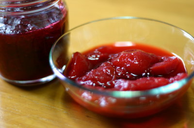 | 7月4日(日) 重い重い腰をあげて、旦那の実家から送られてきた「すもも」を消化すべく作業を開始。中に、傷み始めたものも出てきたので、早くしないとヤバイ。(^^ゞ ネットで検索して出てきたものを片っ端から。まず手始めに「すもものシロップ煮」。かっこよく言えばコンポート? その勢いで「すももジャム」。そして「すももジュース」を作るべく下準備。ま、下準備といっても、選別して洗っただけなんだけど・・・。明日漬ける瓶を買って来なきゃね。こういう作業を鼻歌交じりに楽しんでやれる人になりたいものだわ・・・・。たぶん無理・・・かな・・・。さて、出来は? 結構酸味が強い気がするけど、ま、こんなもんか・・・。自分で作るからレシピよりも控えめにしたけど、こういう類に入ってる砂糖の量を見ると、恐ろしくなるよなぁ〜。 |