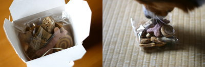 | 7月9日(金) どうして毎日こんなに暑いんだぁ〜〜。からっと暑いならまだ許せるけど、この湿気の多さ・・・。なんともなぁ。アトムのお昼のお散歩も、きっと足の裏が熱いだろうなぁ・・・と、日影があるとそこをアトムに歩かせ、私はお日様の照り返しを受ける・・・。今年もすでに腕が真っ黒だ。(T_T) 今日は、お願いしていたクッキーが届いた。お店は「CAFE CON LECHE」。わんにゃんのクッキー屋さんだ。今回は、お試しセットをお願いした。早速、興味津々のアトム。何個か味見〜であげた。どうやらウマウマらしい。(^o^) 私にもとってもいい匂い〜。思わず食べたくなる程。(笑) いろいろ種類があるので、どれにしようか迷うところだけど、なんだかまたお願いしてしまいそう♪ 話は変わって、今日、初めて移動のメロンパン屋さんをみかけた。今頃?なのだが、こんな田舎にも出現したか・・・。思わず買ってしまいたくなったのだけど、お客さんが誰もいなかった・・・のでやめた。(爆) |
