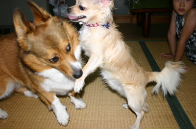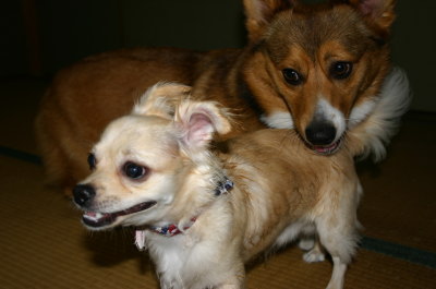 | 7月30日(金) ただいま〜。鹿児島帰省旅行から朝帰ってきました。しばしお昼寝した後、今日は私の実家の辺りの夏祭り、旦那はパスしたけど私は老体にムチ打ってアトムを連れて実家へ。兄一家も集合して夕食を一緒に。兄のうちのもんたとアトムは2度目のご対面。物怖じせずやってくるもんたに対して、アトムは威嚇しっぱなし。(^_^;) でも、少し時間が経つとバトルをして遊び始めた。そうは言っても、コーギーとチワワ。アトムの体当たりでケガしないかとヒヤヒヤしながら、少し遊ばせた。もんたは未去勢のオス。アトムは去勢済み。なんだかもんたがアトムにラブラブになってきて、ずっと付きまとい、スキあらばマウンティング。あまりのしつこさに、後半は逃げ回るアトムでした。(笑) |