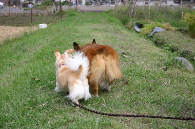 今日のもんたとアトム。とっても仲良さげ→。(笑) やはり、もんたはアトムラブラブのようで、舐め舐め以外にすぐに乗ろうとするから、時折キレるアトム。(^_^;) でも、アトムから離れないだろうって事で、初めて外でフリーに。楽しそうに一緒に走ってた〜♪(カーソルをのせてね) でも、すぐにしつこくアトムに行くから、またお縄に。(笑) |