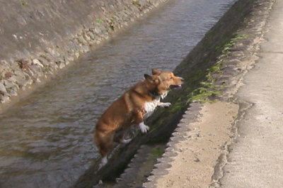 | 12月26日(日) 午前中に年賀状を仕上げた。やれやれ。今日でも元旦に届くのかな? 今日は降水確率高かったのに、青空が出てる。今日は走らせてあげられるかな〜と思っていたら、出かける頃に雨が・・・。でも、霧雨みたいな感じだし、逆に誰もいないだろうからいいかぁと河川敷へ。シャカシャカはいて、頭からフードをかぶって万全の体制。我ながら、アトムに甘いもんだわ。雨が降ったり止んだりの中、ひたすら列車が来るのを待ってGO〜。久々の爆走でした。しかし、今日も川ポチャ。(^_^;) おいおい大丈夫か? #横に階段あるのに、よじ登り中・・・。 |