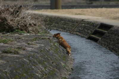 旦那の風邪は残るは咳のみか・・・くらいになってきてたのに、今度はなんかひねったらしくて腰が痛いと大騒ぎ。(^_^;) やはり40も過ぎるとあちこちガタがくるのか?クワバラクワバラ。(爆) 明日はまた雨みたいなのでお散歩はもちろん河川敷へ♪ 今日は無事に電車でGO〜!走った後は当然川ポチャ。近くまで戻って来た後、もう一度川へ。今度はわっせわっせと半泳ぎ。もう好きにして。(笑) ポカポカ陽気だし、もう少しお散歩したいところだけど、ババがいるから仕方ないやね・・・。 |