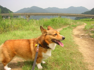 今日はババのお迎えDAY。迎えに行った後、買い物に行く途中の川でアトムのお散歩。昨日届いた新兵器も装着済み。前に、川に下りる階段もあったし、暑かったら水遊びでもいいかな・・・と思って行ったのに、草がぼうぼうで階段がどこかもわからない。その中を突進されても困るので、リード付けてのお散歩に変更。ま、たまにはいいよね。 |