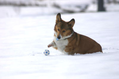 今朝は思ったより雪は積もってなかったみたい。で、起きたらやっぱり頭が痛い・・・。う゛。しかし朝からアトムは絶好調だ〜。(苦笑) 雪かきの後、少しアトムと雪遊び。毎日毎日何度も遊んでも、まだまだ遊び足りないらしい。午後からも少し遊んでいると、いきなり旦那が帰ってきた。月初めの予定では24、25が連休だったのに、結局休めなくなってしまったので、代わりに早く帰ってきたらしい。少し休憩して温泉へ。今日は祝日だから人が多いかも・・・と早めに出発。八鹿の天女の湯に行く事にして、全天候運動場へ。きっと雪が多くて遊べないだろうなぁ・・・と思ったら、やっぱり芝生広場は除雪もしてないし、誰も踏み入れてない。とても遊べる感じじゃない。アトムはおかまいなしに行こうとするけど、私は重みでズボッ。履いている長靴より深いので、入るのも無理。広場の周りの歩道が一部除雪してあったので、そこでサッカー。アトムは大喜び〜♪ 休憩の時は雪を食べてクールダウン。結構便利かも。でも食べ過ぎてお腹を壊さないでよねー。 |